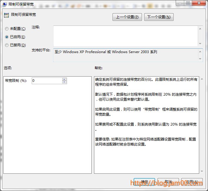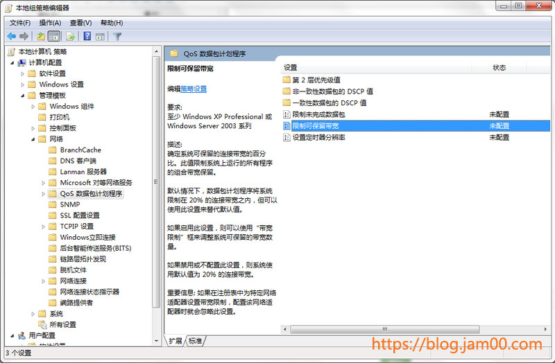 Windows 网速 Windows7限制电脑网速的问题 2018-02-06 14:28 2132 更新于 2018-02-06 14:28 家里办了100M的宽带,但是下载资源好的电影或文件总是达不到10M。但是测速又是9M左右,基本是正常的。 上网百度了下,在win7的两个地方做了下修改,记录下 ### 修改网卡设置 右击`计算机`->`选择属性`->点击左上角的`设备管理器`-> 展开`网络适配器`-> `右击网卡选择属性`->点击`高级`选项->选择`连接速度和双工模式`->在右侧选择`100Mbps 全双工`或`自动侦测` 设备管理器  网卡属性  一般来说,这里是自动侦测的,我是100M的宽度,我就直接选择 “100Mbps 全双工”。 之前我办了的50M的宽带,结果这里设置是 “10Mbps 全双工”,下载速度一直是 1M 左右 ### QoS 数据包设置 win键(左下角Ctrl键或Fn键 和 Alt键之间,有些键盘会有Fn键)+R键 打开运行窗口,或者点击`开始`搜索`运行`后再点击搜索出来的`运行` 在运行窗口输入 `gpedit.msc`,然后回车或点击确定进入策略组 如下图依次展开  双击`限制可保留带宽`,在弹出的窗口中选择`已启用`,带宽限制处填写0,然后点击应用。一般来说这项是未配置或禁用的  也可以设置 20% 来限制当前这台电脑的带宽。